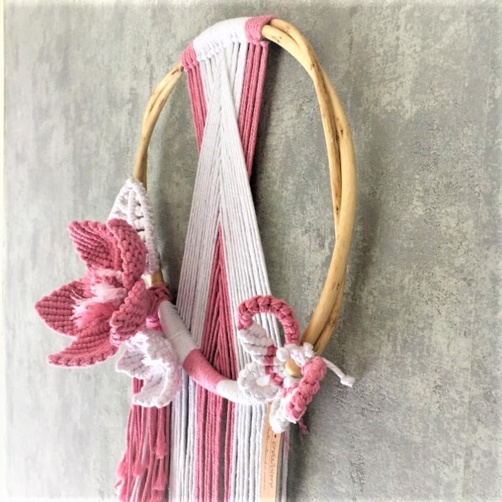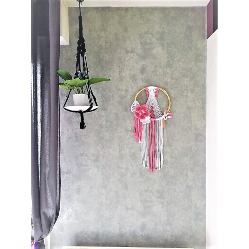 Attrape-rêves / couronne de fleurs en macramé coton rose et blanc